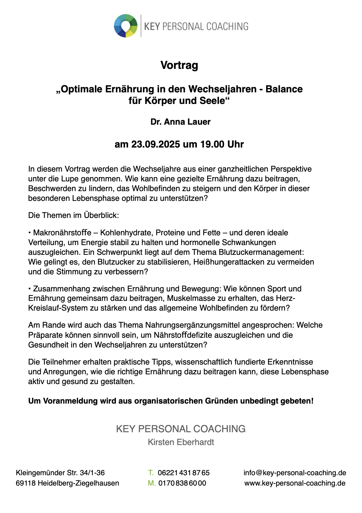 Vortrag „Ernährung in den Wechseljahren“ am 23.09.2025